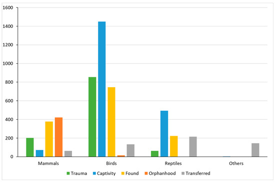 Over the two-year period (2020–2021), birds were the most admitted native animals at the center, followed in smaller proportions by mammals, and, lastly, reptiles. The main causes of admissions to the center were ‘captivity’, ‘found’, and ‘trauma’.