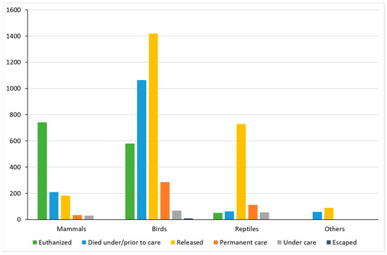 Birds were the class with the highest release rate, followed by reptiles. Also, the main cause of admission of birds and reptiles was ‘captivity’. The analysis of the outcomes showed that ‘captivity’ had the highest release rate. Rescued animals admitted to the center due to ‘captivity’ are mostly healthy adults or juveniles that do not need treatment, as is confirmed by the large percentage of released of clinically healthy animals. According to a study on wildlife rehabilitation centers in Catalonia, a high percentage of released animals rescued from captivity is attributed to the high percentage of healthy animals [