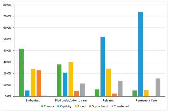 The analysis of rehabilitation outcomes showed that ‘trauma’ and ‘orphanhood’ had the highest percentages of mortality. Trauma related to anthropogenic activities represented the most frequent cause of mortality, consistent with previously published literature [
