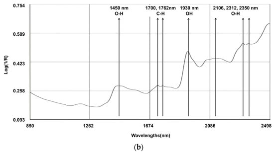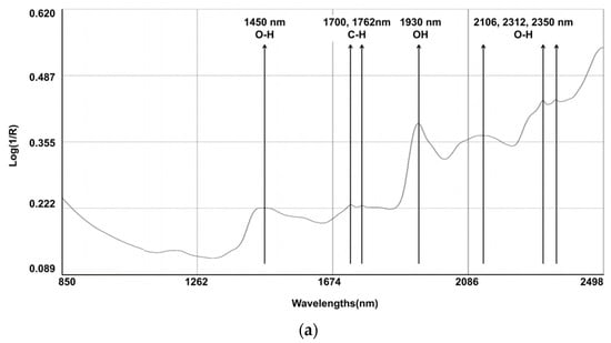 Cattle fecal compounds are composed of various chemical bonds and functional groups, including C-H, O-H, and N-H, which originate from undigested residues and end products. These components contribute to the NIR spectral information, which is closely associated with dietary digestibility. The log (1/R) reflectance spectra of the fecal samples were similar to those observed in other studies [6,33,34]. Several characteristic bands were identified: 1450 nm (corresponding to the 1st overtone of the O-H stretch, indicating water content); between 1700 and 1762 nm (associated with the 1st overtone of C-H stretch in CH2 and CH3 groups, indicating fat content); 1930 nm (a combination band of the O-H bend and stretching vibrations of water); and 2106 nm, 2312 nm, and 2350 nm (combination bands associated with C-O stretching and bending vibrations, indicating the presence of starch and protein absorption) [33].