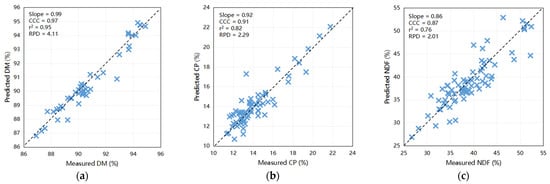 The external validation results for the calf model were concordant with the internal validation results, as shown in Figure 2. Predictive accuracy was highest for ash (Slope = 1.04, CCC = 0.97, r2 = 0.95, RPD = 2.19) and DM (Slope = 0.99, CCC = 0.91, r2 = 0.83, RPD = 2.26), whereas some disparities were observed in the predictions for CP (Slope = 0.80, CCC = 0.83, r2 = 0.75, RPD = 1.40), ADF (Slope = 0.76, CCC = 0.86, r2 = 0.76, RPD = 1.62), and EE (Slope = 0.79, CCC = 0.88, r2 = 0.84, RPD = 1.21) when compared to the wet chemistry method. However, the predictions for starch (slope = 0.73, CCC = 0.81, r2 = 0.66, and RPD = 1.38) and NDF (slope = 0.59, CCC = 0.66, r2 = 0.45, and RPD = 1.10) did not achieve the desired levels of accuracy. These results provide valuable insights into the robustness and limitations of predictive models and suggest avenues for future refinement and enhancement.