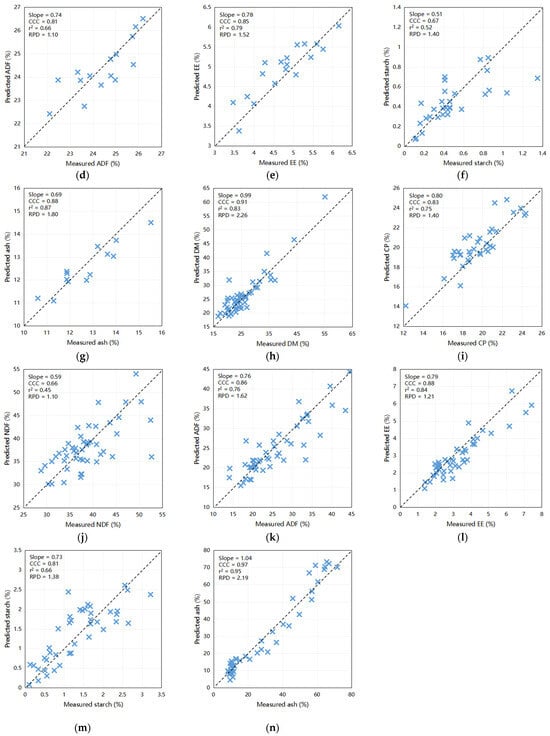 Scatter plots comparing NIRS predicted values to laboratory measured values of dairy cattle feces for various components: (a) DM for cows (n = 44), (b) CP for cows (n = 68), (c) NDF for cows (n = 75), (d) ADF for cows (n = 15), (e) EE for cows (n = 18), (f) starch for cows (n = 30), and (g) ash for cows (n = 13); (h) DM for calves (n = 51), (i) CP for calves (n = 35), (j) NDF for calves (n = 48), (k) ADF for calves (n = 47), (l) EE for calves (n = 44), (m) starch for calves (n = 41), and (n) ash for calves (n = 44). DM = dry matter; CP = crude protein; EE = ether extract; NDF = neutral detergent fiber; ADF = acid detergent fiber; r2 = the correlation coefficient of external validation; CCC = concordance correlation coefficient; SEP = standard error of prediction; RPD = ratio of performance to deviation (SD/SEP). Bisecting line indicate (x = y).
