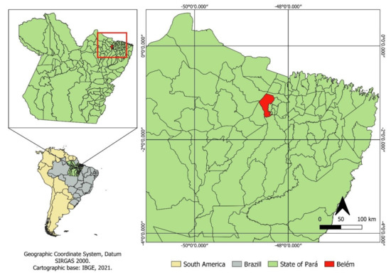 The experimental test was carried out at Embrapa Amazônia Oriental (01°26′ S and 48°24′ W) in Belem, Pará, (Figure 1), in the period from July 2013 to June 2014, during the rainy season of the year (January to April), specifically from February to March. The climate is tropical rainy Am, according to the Köppen classification, with an average annual rainfall of 2500 mm, an average temperature of 27 °C, and a relative humidity of 85%, and it has an Af2 climate, according to the Köppen classification adapted by Martorano et al. [27].