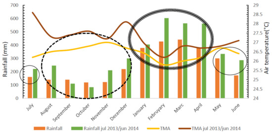Climatological normal data compared to those observed during the experimental period in the municipality of Belém, Pará. Note: TMA = Average air temperature; TMA Jul 2013/Jul 2014 = average annual temperature.