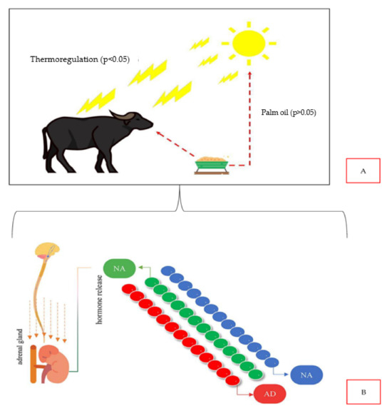 (A) Experiment result infographic (the authors). (B) Graphic representation of the stress stimulus in buffaloes that triggers the release of catecholamines by the sympathetic nervous system, namely adrenaline (AD) and noradrenaline (NAD), as well as cortisol (CT) by the adrenal gland Adapted from [6].