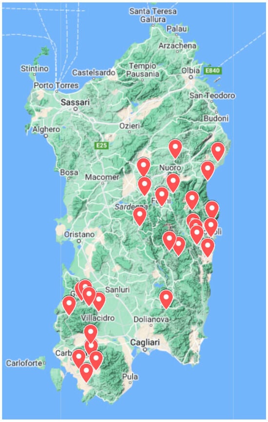 Geographic map showing the distribution of sampling farms in Sardinia. Made with Google MyMaps, https://www.google.com/intl/it/maps/about/mymaps/ (Last accessed on 16 November 2023).