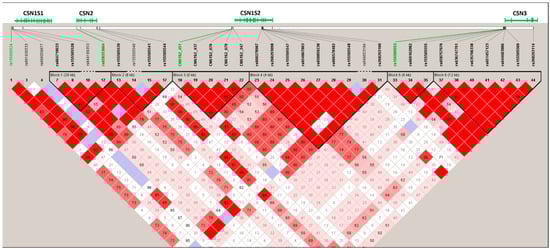 LD structure of the casein gene cluster DNA region in a population of 825 Sarda does. The structural organization of the four casein genes respects gene positions on goat chromosome 6, as represented in Genome Data Viewer (https://www.ncbi.nlm.nih.gov/genome/gdv/?org=capra-hircus, last accessed on 18 November 2023). LD plot of pairwise normalized coefficient of linkage disequilibrium (D′): coloured in red, D′ = 1.0 and logarithm of the odds (LOD) ≥ 2.0; coloured in light blue, D′ = 1.0 and LOD < 1.0.