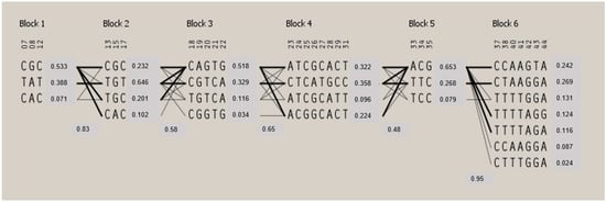 After the exclusion of SNPs out of HWE and those with MAF values lower than 0.05, the casein cluster’s haplotype structure included 35 SNPs for does and 38 SNPs for bucks, spanning about 231 kbp, with an average distance between SNPs of 5.3 kb, ranging from 3 bp to 102 kbp. Block 1 (28 kb) in the doe population included two tag SNPs of the CSN1S1 gene located in the promoter region and one SNP of the CSN2 gene located in exon 9 (Figure 1). The same structure was visible in the buck population, in which block 2 included three SNPs from the CSN1S1 gene and two SNPs from the CSN2 gene. The CSN1S2 and CSN3 genes displayed two haplotype blocks each in both populations. In both populations, block 6 consisted of six SNPs, and had seven different haplotype combinations, while block 1 and block 5 comprised three SNPs, and had three possible haplotype combinations (Figure 3 and Figure S1).