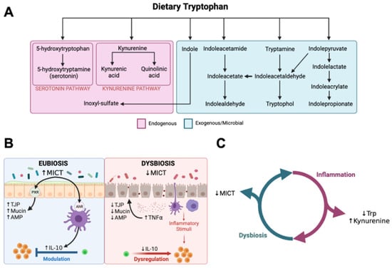 Recent studies have revealed altered tryptophan catabolism in humans with IBD, characterized by decreased serum concentrations of tryptophan and indolepropionate, decreased fecal concentrations of indoleacetate, and increased serum concentrations of kynurenine pathway catabolites [22,23,24,25,26]. Serum tryptophan concentrations were inversely correlated with disease activity and serum C-reactive protein, whereas increasing ratios of kynurenine–tryptophan were associated with increased odds of observing endoscopic inflammatory lesions and worse clinical outcomes in humans with IBD [23,24]. Mechanistic investigations in rodents and in vitro with human intestinal epithelial cell cultures implicate MICTs in regulating intestinal mucosal inflammation and mucosal barrier function (Figure 1B). MICTs induce aryl hydrocarbon (AhR) and pregnane-X (PXR) receptor-mediated expression of tight junction proteins (TJP), mucin, anti-microbial peptides (AMP), and anti-inflammatory cytokines (e.g., IL-10) while decreasing the expression of pro-inflammatory cytokines (e.g., TNFα) in the enteric mucosa. [12,15,20,27,28,29,30,31]. A variety of bacteria are known to catabolize tryptophan into MICTs, including various species of Lactobacillus, Bacteroides, Bifidobacterium, Peptostreprococcus, and Clostridium, which are often decreased in EMD associated with chronic enteropathies in humans and other animal species, including cats [15,30]. Not only are MICTs potential biomarkers for disruptions in gut microbial metabolism, but they are also promising therapeutic targets. For example, the administration of probiotics containing MICT-generating species and/or dietary MICT supplementation ameliorates mucosal inflammation and EMD in animal models of IBD [30,32,33].