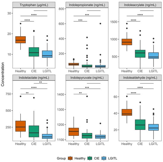 Serum concentrations of tryptophan (p < 0.001) varied significantly among the groups (Table 2; Figure 2) and were lower in the CIE (median 10.8 µg/mL, IQR = 9.0–13.3; µg/mL; p < 0.001) and LGITL (median 9.3 µg/mL, IQR = 8.4–11.7; µg/mL; p < 0.001) groups compared with those in the healthy controls (median 16.9 µg/mL, IQR = 15.5–18.7). There were no significant differences in serum tryptophan concentrations between the CIE and LGITL groups (p = 0.17). Serum concentrations of kynurenine (p = 0.23) and kynurenate (p = 0.63) did not vary significantly among the groups, despite being higher in the CIE and LGITL groups compared with those in the healthy controls. There were no significant differences in serum serotonin concentrations (p = 0.15) among the groups.