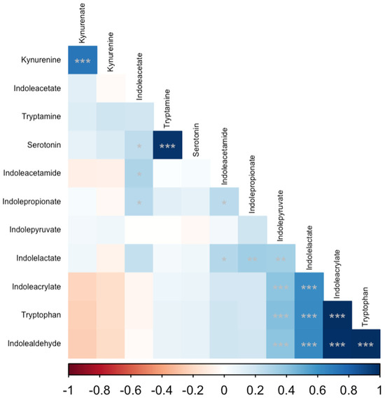 Correlation matrix of serum tryptophan catabolites. Spearman’s rank correlation coefficients were calculated for all pairwise combinations. The intensity of the colored cells is proportional to Spearman’s rho, with blue cells indicating a positive correlation and red cells indicating a negative correlation. The matrix is ordered by the first principal component of the correlation matrix. Each cell is annotated with asterisks corresponding to the p-value for a given correlation: * p < 0.05; ** p < 0.01; *** p < 0.001.