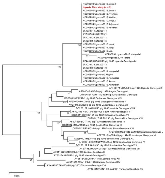 African swine fever (ASF) is an important transboundary animal disease affecting swine, and has morbidity and mortality rates approaching 100%. In the continued absence of an effective vaccine and treatment options, it remains a devastating threat to the pig industry [,]. The disease is caused by the ASF virus (ASFV), an arthropod-borne virus belonging to the family Asfaviridae and genus Asfivirus. Since its initial identification in pigs in Kenya in 1921 [], it has been reported in Uganda, where it is now endemic. ASF is caused by a complex and large enveloped DNA virus with a genome of 170–190 kbp []. Up to 24 different genotypes have been shown to occur in sub-Saharan Africa based on C-terminal p72 sequencing [,,,].