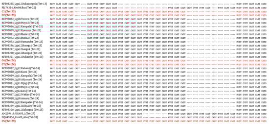 The five ASF-positive sequences identified by CVR- 9RL ORF amplification and sequencing were translated. Each of the three variants were used in BLAST nucleotide searches against the Genbank database (https://blast.ncbi.nlm.nih.gov/Blast.cgi), accessed on 15 December 2023, to identify related, homologous sequences. The predicted amino acid sequences were visually aligned by tetrameric repeat, as captured in Figure 2. The Tet-23 and Tet-24 variants have previously been reported from Uganda, but Tet-29 has not.