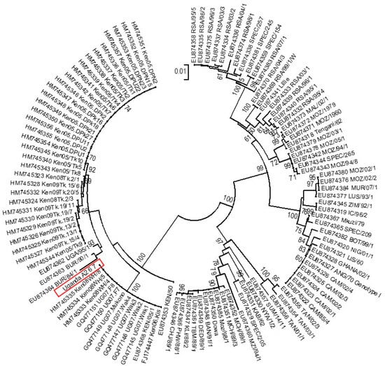 Following nucleotide sequence alignment of the eight viruses characterized in this study (Table 2), two TK gene variants (differing from each other at a single nucleotide site) were detected, and their relationship to available homologous data was inferred as shown in Figure 4. TK variant 2 (TK-V2) was detected at the Kibaale sampling site (Samples T3 and T5).