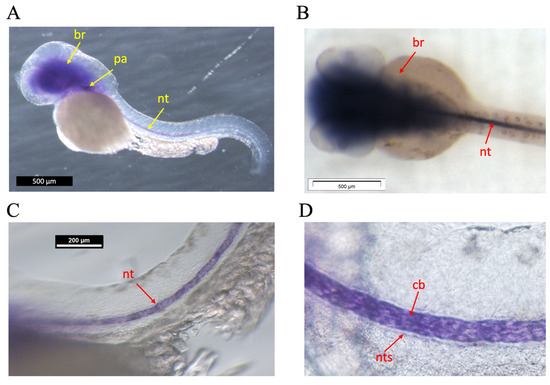 To gain insight into the expression domain of the efemp1 gene during early zebrafish development, we performed whole mount in situ hybridization experiments on 48 hours post-fertilization (hpf) zebrafish embryos (Figure 1). efemp1 was expressed in the brain (br), in the pharyngeal region (pa), and in the notochord (nt) along the entire length of the trunk (Figure 1A,B). Closer inspection of the expression in the notochord revealed that it was seen in the chordoblasts (cb) (Figure 1C,D), responsible for secretion of the notochordal sheet (nts) [45,46]. No labelling was observed in 24, 96, or 120 hpf larvae.