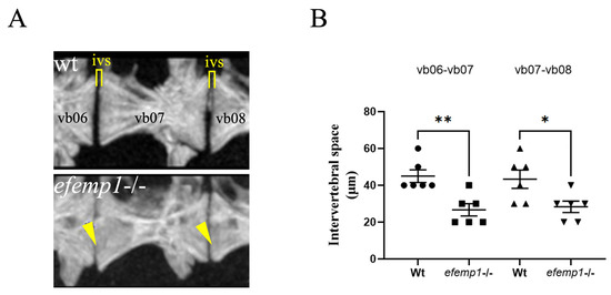 Reduced intervertebral disk space and bone spurs observed in the spine of efemp1−/− adult zebrafish. (A) Closeup view of pre-caudal vertebrae 6–8 (L to R) for wt and efemp1−/−, clearly showing reduced intervertebral disk space and bone spurs, indicated by yellow bar and arrowheads, respectively. (B) Intervertebral disk space calculated between vb06-vb07 and vb07-vb08 (n = 6 fish/group), revealing significant reduction of the intervertebral disk space in the efemp1−/− zebrafish adults. The values are expressed as mean ± SEM, significance: * p < 0.05, ** p < 0.01, as determined by ordinary one-way ANOVA test.