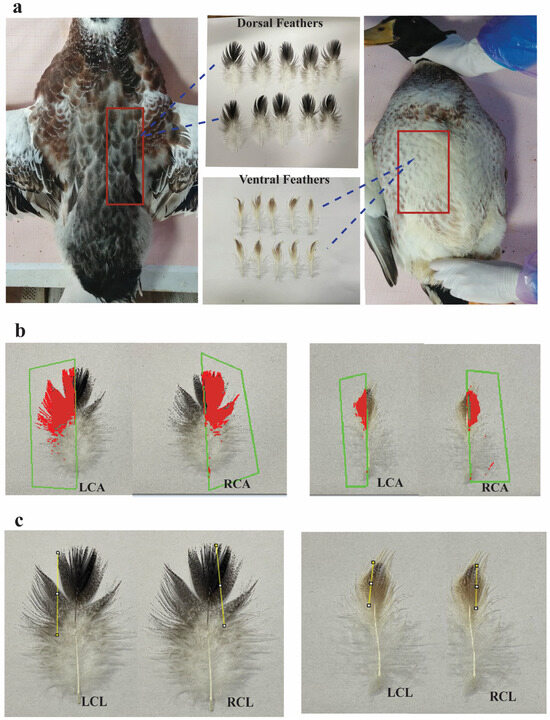 Feather types and color traits measured on dorsal and ventral feathers. (a) Body regions from which feathers were collected. (b) Measurement of left color area (LCA) and right color area (RCA) of dorsal and ventral feathers; the red shape indicates the selection of the colored area. (c) Measurement of left color length (LCL) and right color length (RCL) of dorsal and ventral feathers.