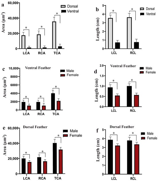 The comparison of means of the feather color phenotypes of the Tianfu Nonghua ducks. (a) Comparison of means of the pigmentation patterns of the dorsal and ventral feather area parameters: left color area (LCA), right color area (RCA), total color area (TCA). (b) Comparison of means of the pigmentation patterns of the dorsal and ventral feather length parameters: left color length (LCL), right color length (RCL). (c) Comparison of means of ventral feathers’ area parameters between males and females. (d) Comparison of means of ventral feathers’ length parameters between males and females. (e) Comparison of means of dorsal feathers’ area parameters between males and females. (f) Comparison of means of dorsal feathers’ length parameters between males and females (the asterisks mean the p < 0.05).