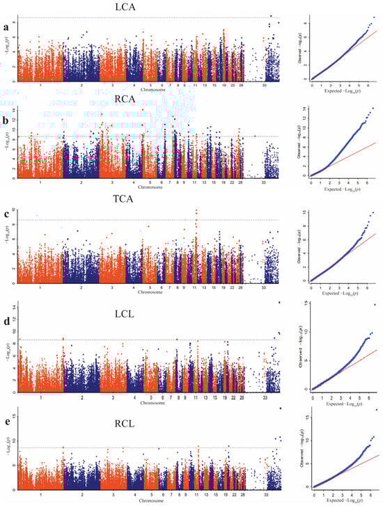 Manhattan and QQ plots for the dorsal feather traits. (a) Left color area (LCA). (b) Right color area (RCA). (c) Total color area (TCA). (d) Left color length (LCL). (e) Right color length (RCL). The x-axis shows the physical positions of each SNP along the chromosome, and the y-axis shows the −Log10p values of SNP. The gray dotted lines represent the Bonferroni threshold level (correction threshold = 8.59).
