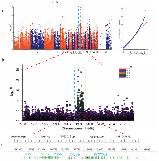The Manhattan plot of the TCA showed that there was a peak of SNPs on chromosome 11 (Figure 4a). A total of three SNPs surpassed the Bonferroni significant threshold level. These SNPs were distributed in the 19791413–19843385 bp on chromosome 11. Three candidate genes, INTS14, HACD3, and DENND4A, were found in this region. To determine the association between the leading SNP (Chr11: 19791413 bp) and SNPs within the QTL (Chr11:18.79–20.79 Mbp), a correlation analysis was completed. The results showed that a total of 26 SNPs were highly correlated (pairwise r2 > 0.4; (Table S11 and Figure 4b). In this range, five candidate genes, DPP8, HACD3, INTS14, SLC24A1, and DENND4A, were identified (Figure 4c, Table 2).