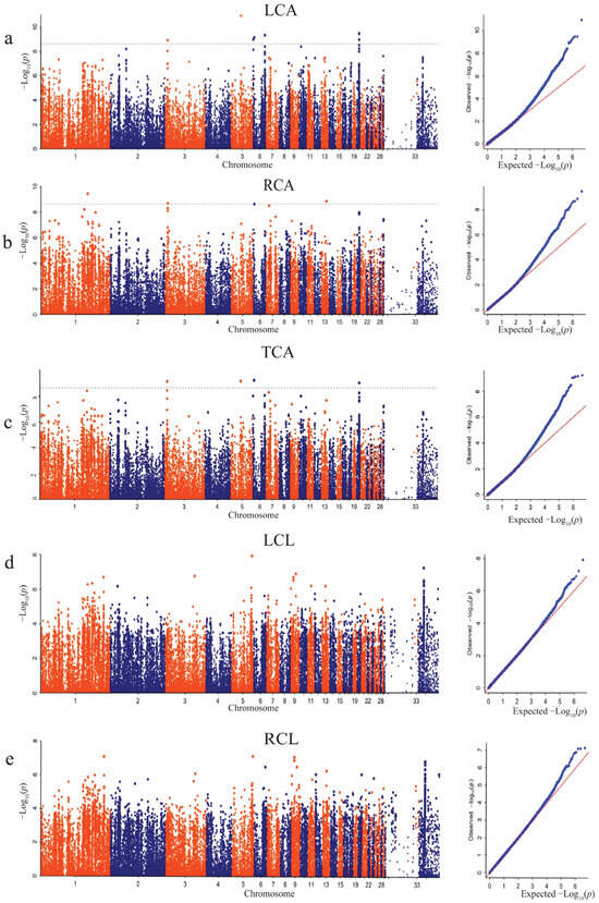 Manhattan and QQ plots for the ventral feather color traits. (a) Left color area (LCA). (b) Right color area (RCA). (c) Total color area (TCA). (d) Left color length (LCL). (e) Right color length (RCL). The x-axis depicts the physical locations of each SNP along the chromosome, while the y-axis depicts the −Log10(p) values of SNP. The gray dotted lines signify the Bonferroni threshold level (correction threshold = 8.59).