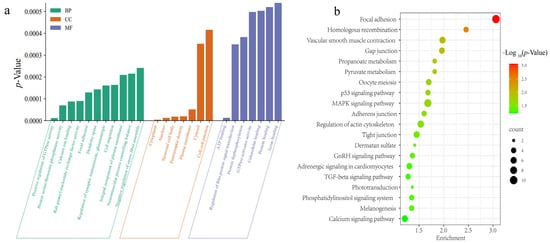 GO and KEGG enrichment analysis of the candidate genes. (a) GO enrichment analysis for the candidate genes. The y-axis indicates the p-values; the x-axis indicates the GO terms. Bars represent the p-value of each GO term. (b) KEGG enrichment analysis for the candidate genes. The x-axis represents the gene ratio, and the y-axis represents the KEGG pathways. The dot color represents the p-value, and the dot size represents the number of genes enriched in the reference pathway. Smaller −Log10 (p-values) are indicated by green, and larger values are indicated by red color.