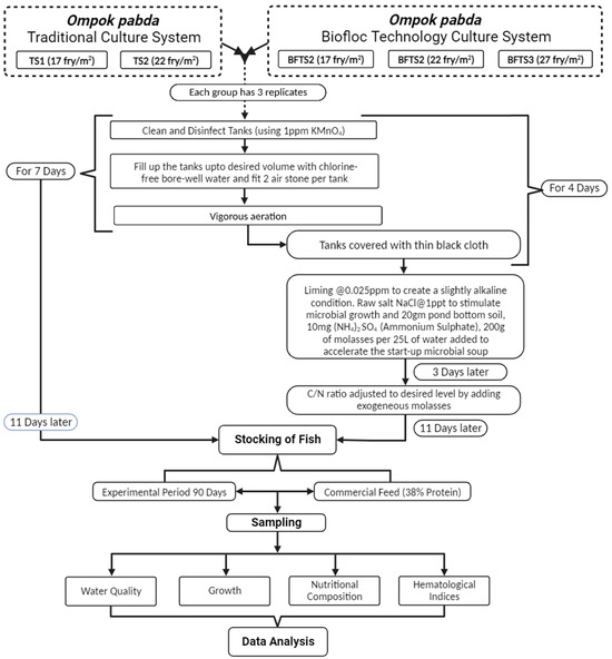 The current study was conducted using five treatments each with three replications: the stocking density of traditional culture system (i.e., the cultivation system being currently practiced by the local pabda fish farmers) were 17 fry/m2 (TS1) and 22 fry/m2 (TS2) and for the BFT, three individual treatments of BFTS1, BFTS2, and BFTS3 were established with 17, 22, and 27 fry/m2, respectively. The range of the stocking density 17 and 22 fry/m2 was obtained from the baseline survey among the pabda farmers of the Jashore region and the stocking density of BFTS3 was assumed to assess the higher stocking density in BFT. The traditional culture system involves culture of fish in tanks or artificial enclosures without addition of organic carbon source. According to the methodology outlined by Debbarma et al. [43], water from a bore well, devoid of chlorine, was used to fill all the experimental tanks, and the tank water was intensely ventilated for four days prior to the start of the research. Before stocking fry, a KMnO4 solution of 5 ppm was used to sterilize all of the experimental tanks. The tanks were covered with a thin black cloth to generate the diffused lighting environment necessary for the quick growth of the heterotrophic populations. Molasses (24% w/w carbon) was chosen since it is one of the most regularly used or investigated ingredients in biofloc production [43,44,45], easily accessible nearby, and a low-cost product. In accordance with the theory of Avnimelech [17], the previously weighed organic carbon source was mixed with the feed containing 38% crude protein daily to maintain a C:N ratio of 20:1 for encouraging biofloc growth in the tanks. Throughout the experiment, no water in any treatment was exchanged.