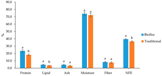 Proximate composition of the floc (% dry weight); different letters indicate significant statistical differences (p < 0.05).