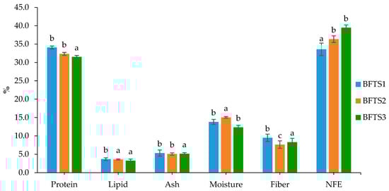 Between the BFT and traditional systems, the O. pabda carcass’s proximate composition (% dry weight) significantly (p < 0.05) differed for protein (18.19–23.47%) and lipid (3.61–4.64%) content (Figure 2). However, the ash and moisture content did not differ significantly (p > 0.05) between the BFT and traditional groups. With different stocking densities, the nutritional composition of the biofloc varied in the BFT system (Figure 3); the BFTS1 had higher levels of crude protein (34.08 ± 0.41%), crude lipid (3.66 ± 0.38%), and ash (5.33 ± 0.83%). On the other hand, the content of NFE (nitrogen free extract) was higher in the BFTS3 (39.46 ± 0.77%) than in other treatments.