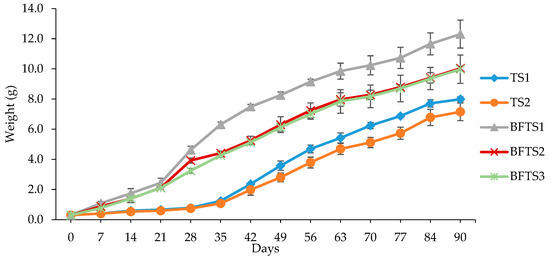 The growth performance (average body weight) of O. pabda reared in the biofloc (BFT) and traditional (TS) culture systems at different stocking densities.