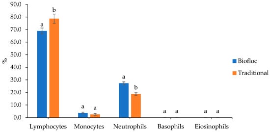 Differential hematocyte count (%) of O. pabda reared in biofloc (BFT) and traditional system (TS) at the end of the 90-day experimental period; different letters indicate significant statistical differences (p < 0.05).