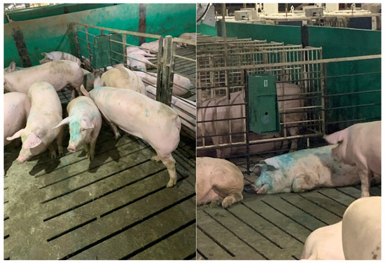 Photo of gilts in an experimental pen. (Left) Note the one gilt facing the camera that is in estrus and has green dye on her forehead. (Right) Note the gilt lying under the sprayer with green dye indicating she is in estrus (she has self-applied BB from the green sprayer). This gilt also stayed close to the sprayer when she was in full standing estrus. The sprayer works via the pig rooting and pushing the device, which delivers a 4 mL spray of BB. These pens of gilts did not have boar exposure as the control pens did.