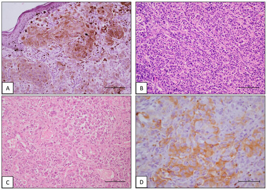Immunohistochemical analysis was carried out to confirm the diagnosis of melanoma and to assess the expression of HER-2 and HER-3 receptors. In the first case, a monoclonal mouse anti-Melan A (IS633, Dako, Glostrup, Denmark clone A103, dilution 1:100) and a monoclonal mouse anti-Melanoma Antigen (PNL2, 33-528-100, ProSci, Poway, CA, USA, dilution 1:100) were used. To evaluate the expression of the two members of the epidermal growth factor receptor (EGFR) family, a monoclonal rabbit anti-HER 2 (A048529-2, Dako, Glostrup, Denmark, dilution 1:50) and a polyclonal rabbit anti-HER 3 (BSB263, Bio SB, Santa Barbara, CA, USA, clone RBT-HER3, dilution 1:50) were employed. After deparaffination in xylene and rehydration in graded alcohol, before starting immunohistochemistry IHC procedures, pigmented lesions underwent a supplementary phase of bleaching by incubating them in 6% diluted hydrogen peroxide overnight at room temperature [24]. Briefly, immunohistochemical protocols included an antigen retrieval phase performed in a microwave with citrate buffer pH 6.0, boiling the sections for 4 min at 1000 W and 12 min at 200 W, followed by endogenous peroxidase activity blocking by incubating sections in Bloxall Blocking solution (SP-600, Vector, Burlingame, CA, USA) for 10 min. Ultra V Block (Thermo Fisher Scientific, Fremont, CA, USA) was employed to block nonspecific bindings for 5 min, and then sections were incubated overnight at 4 °C with the specific primary antibody. The following day, the sections were incubated with the secondary antibody (Biotinylated antibody universal, Anti-mouse/rabbit IgG, made in Horse, Vector Labs, Inc., Burlingame, CA, USA) for 20 min and then with streptavidin–biotin–peroxidase complex (Horseradish Peroxidase Streptavidin, Vector Labs, Burlingame, CA, USA) for a further 20 min. Finally, chromogen diaminobenzidine (Impact DAB, Vector Labs, Burlingame, CA, USA) was employed to develop the colorimetric reaction and Mayer’s hematoxylin to counterstain. The sections were then observed under a light microscope.