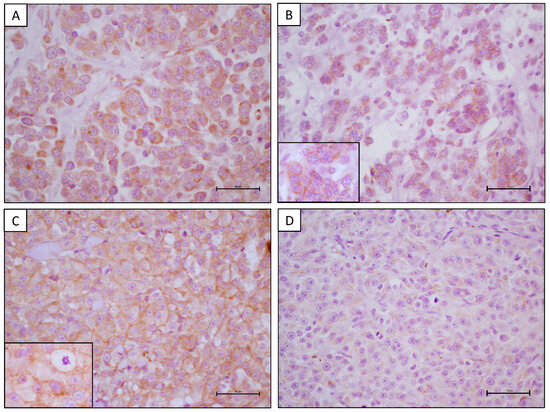 Expression of HER-2 (A–C) and HER-3 (B–D) in canine malignant melanomas. (A) Strong incomplete membranous HER-2 staining in more than 10% of cells and complete HER-2 staining in less than 10% of cells (score 2+). IHC with anti-HER-2 antibody, scale bar 50 μm. (B) Moderate cytoplasmic HER-3 staining in a minimum of 30% of cells (score 2+). Insert: Strong, incomplete membranous HER-3 staining in some cells. IHC with anti-HER-3 antibody, scale bar 50 μm. (C) Strong, complete membranous HER-2 staining in more than 10% of cells (score 3+). Insert: Particularly strong, incomplete membranous HER-2 staining in neoplastic cells showing mitosis and atypia. IHC with anti-HER-2 antibody, scale bar 50 μm. (D) Weak cytoplasmic HER-3 staining in a minimum of 30% of cells (score 1+). IHC with anti-HER-3 antibody, scale bar 50 μm.