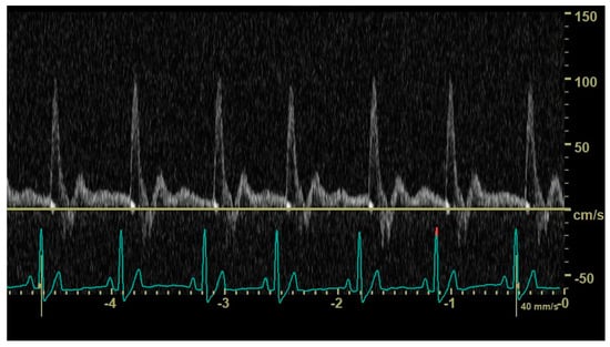 The perfusion requirements of each organ determine the characteristics of the respective vascular bed, which, in turn, influences the flow profile of the associated vessels. Peripheral arterial Doppler waveform description is based on, among other things, the display of the flow components relevant to the zero-flow baseline []. In humans, in the absence of disease, the abdominal aortic waveform is described as multiphasic, with an initial systolic sharp upstroke produced by the contraction of the left ventricle and by the consequent high-velocity forward movement of a bolus of blood. The diastolic component will then depend on the level of vasoconstriction present in the resting muscular beds. Due to the high resistivity of the vascular bed of the hind limbs, the aortic Doppler tracing obtained caudally to the renal arteries will show a retrograde wave in early diastole, due to the backward movement of blood. An antegrade component should then be observed in mid-to-late diastole, produced as a result of an antegrade wave generated by proximal compliant large and medium-sized arteries []. In the presence of a PDA, a phenomenon called “ductal steal” occurs, for which blood flows from the aorta into the pulmonary artery throughout the cardiac cycle []. Due to this phenomenon, when left-to-right shunting of blood is substantial, the diastolic antegrade flow in the post-ductal aorta can disappear or even become retrograde []. Therefore, an absent or retrograde diastolic flow recorded in this vessel would suggest systemic hypoperfusion and therefore be considered indicative of an hsPDA [].
