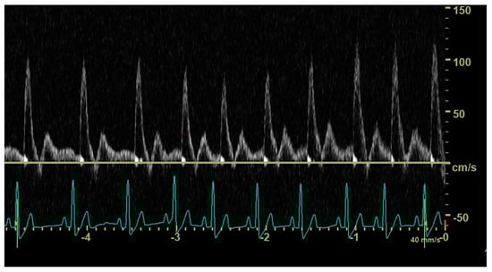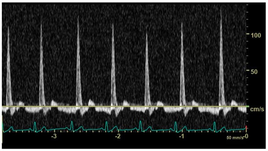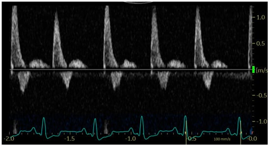 In diastole, when the aortic segment caudal to the renal artery is imaged, a triphasic flow pattern is expected in healthy subjects, characterized by an initial negative deflection followed by a positive rebound and a third phase referred to as end-diastolic flow []. Based on the direction of the end-diastolic flow, abdominal aortic flow patterns were classified as one the following three types: antegrade when blood flowed caudally at the end of diastole (Figure 1); absent when no blood flow could be detected at the end of diastole (Figure 2); retrograde when blood flowed cranially at the end of diastole (Figure 3) [].