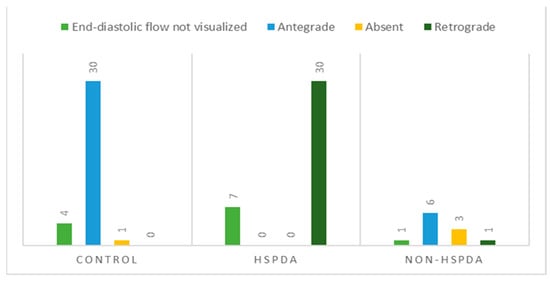 In the rest of the dogs, the following patterns were observed (Figure 5): antegrade (30/35 controls and 6/11 dogs with a non-hsPDA), absent (1/35 controls and 3/11 dogs with a non-hsPDA) and retrograde (30/37 dogs with an hsPDA and 1/11 dogs with a non-hsPDA).