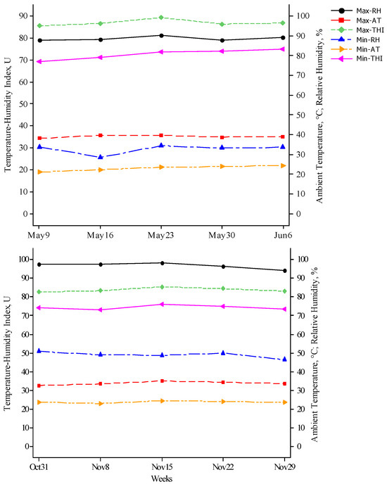 Weekly maximum and minimum values of the temperature–humidity index (THI), ambient temperature (AT), and relative humidity (RH) during spring (above) and autumn (below).