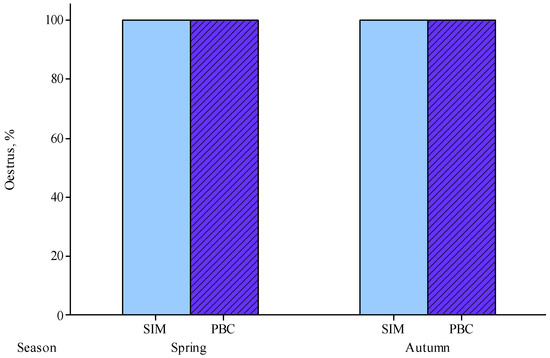 On the other hand, the frequency of SIM ewes during the first period (1–17 d) of the oestrus cycle was more than PBC ewes. Then, PBC ewes during the second period (18–35 d) of the oestrus cycle were more than SIM ewes. According to the classification of Sasa et al. [27], the timing of both oestrus cycles determined during the study period was standard, in agreement with the average of the oestrus cycle tended to be higher in the autumn than in the spring. In a coincidence, Macías-Cruz et al. [48] reported a similar average to our study in 17 d of the oestrus cycle in Pelibuey ewes under HS in northern Mexico.