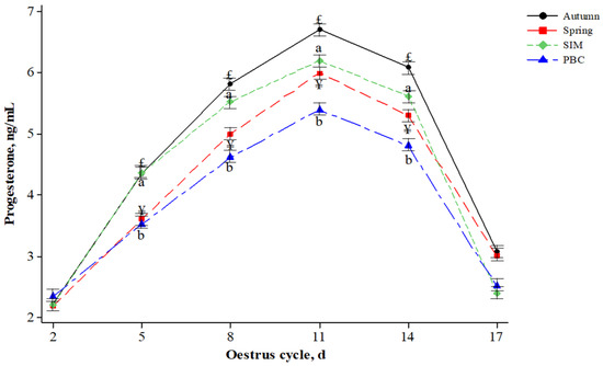 The assessment of corpus luteum activity is entirely unprecedented. Marked differences between SIM and PBC ewes and between spring and autumn seasons according to the sample days of the oestrus cycle agree with authors from northern Mexico [8]. Although SIM and PBC ewes showed clear signs of oestrus and ovulation at least once during the study period, they likely show some reproductive seasonality according to P4 concentration, which was lower in PBC ewes or in the spring season. This is due to the pronounced seasonality that wool sheep have inherited from their ancestors, with the reproductive season traditionally occurring mainly in the autumn and winter months and, to a lesser extent or not at all, in the spring and summer months. Consistent with our study, a study conducted on Yankassa sheep in Nigeria showed higher serum P4 during dry months and lower serum P4 during wet months [21]. The same authors mentioned that P4 typically prepares the uterus for the zygote’s arrival from the oviduct’s ampulla, its implantation, and the subsequent embryonic and fetal development during pregnancy. Finally, given that HS conditions exist almost year-round, given the decreases in P4 found in this study based on the literature, and ignoring the possibility that these decreases are specific to our breeds, P4 can play an essential role in assisted reproduction programs in most oestrus synchronization protocols. To aid in oestrus synchronization, it can be administered by a variety of routes, including the controlled internal drug release (CIDR) device, medroxyprogesterone acetate (MAP), and fluorogestone acetate (FGA) [59]. In addition, it is common practice to supplement P4-based protocols with gonadotropins such as eCG, pregnant mare serum gonadotropin (PMSG), and gonadotropin-releasing hormone (GnRH) at the end of the synchronization phase to enhance fertility [59,60,61].