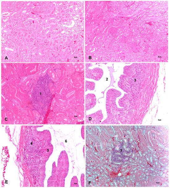 Kidney histopathology stained with hematoxylin and eosin (HE). (A,B) Normal histology, with no histopathological changes in samples from the high Ca/P ratio diet group. (C,D) Samples from the medium Ca/P ratio group with mild lymphocytic interstitial infiltration (1), collecting tubule lumen (2), and lymphocytic infiltrate in the collecting tubule mucosa (3). (E,F) Samples from the low Ca/P ratio group with lymphocytic infiltration in the collecting tubule mucosa (4), collecting tubule lumen (5), collecting tubule epithelial cells (6), and mild interstitial lymphocytic infiltration in the renal cortex (7).