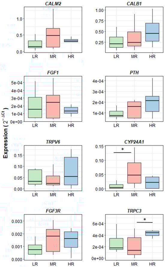 All the evaluated genes were expressed in the kidney tissue, and the Cts varied from 15.65 to 37.39. Of the eight target genes analyzed, two were DE between groups. The CYP24A1 gene was upregulated by about 2.5-fold (p.adj < 0.05, Supplementary Table S3) in the MR compared to the LR group (Figure 2), and the TRPC3 gene was about four times more expressed in the HR than in the MR group (p.adj ≤ 0.05).