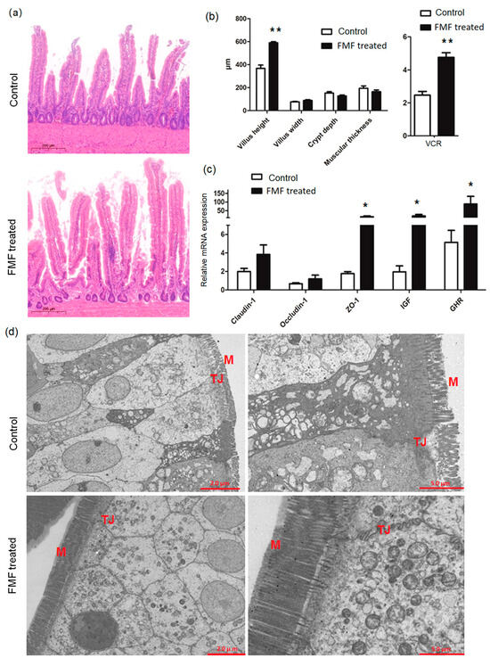 Dietary supplementation with fermented feed improved the intestinal function of squabs. (a) A histopathological section of the ileum stained using hematoxylin and eosin and visualized at 200 um. Tissue samples were collected at 25 days of age and were fixed in formalin for routine H&E staining. The section is representative of 12 samples from each group. (b) Morphological measurements of the ileum. Data are presented as the mean ± SD values of each group (n = 12). (c) The effects of dietary supplementation with fermented feed on the mRNA expression of tight junction proteins in the ilea of squabs. Data are presented as the mean ± SD values of each group (n = 12). (d) Transmission electron microscopy analysis of the ileum. The section is representative of 6 samples from each group. Data were analyzed using Student’s t-test, and p-values were considered statistically significant at * p < 0.05 and ** p < 0.01. VCR, the ratio of villus height to crypt depth; M, microvilli; TJ, tight junction; IGF-1, insulin-like growth factor-1; GHR, growth hormone receptor; FMF, fermented mixed feed; H&E, hematoxylin and eosin.