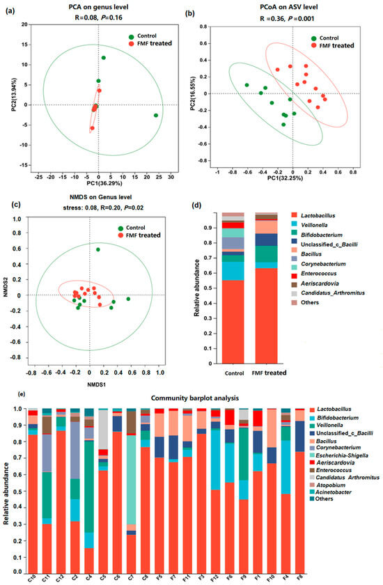 Bacterial composition and diversity were analyzed between the control and FMF−treated groups. (a) Principal component analysis (PCA). (b) Principal coordinate (PCoA) analysis. (c) Non-metric multidimensional scaling (NMDS) analysis. (d) Distribution of taxa between control and FMF-treated squabs at 25 days of age (each color represents one bacterial genus). Mean phylum-level relative abundances as detected via 16S rRNA sequencing. (e) Microbial relative abundance at the genus level for the control and FMF-treated groups. The contents of the squabs’ ilea were collected at 25 days of age. Nine samples from the control group and eleven samples from the FMF-treated group were used for bacterial composition and diversity analyses. C: control; F: FMF-treated group. Data were analyzed using the Wilcoxon rank-sum test, and p-values were considered statistically significant at p < 0.05 and p < 0.01.