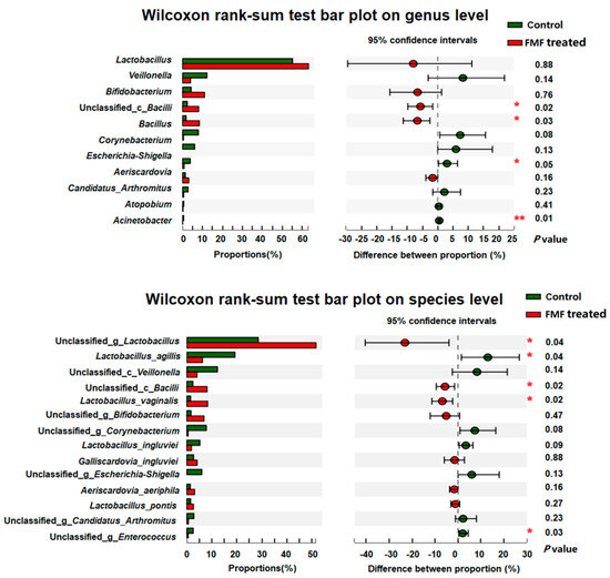Bacterial genera and species differed between the control and FMF-treated groups. The contents of the squabs’ ilea were collected at 25 days of age. Nine samples from the control group and eleven samples from the FMF-treated group were used for genus and species difference analyses. Data were analyzed using the Wilcoxon rank-sum test, and p-values were considered statistically significant at * p < 0.05 and ** p < 0.01.