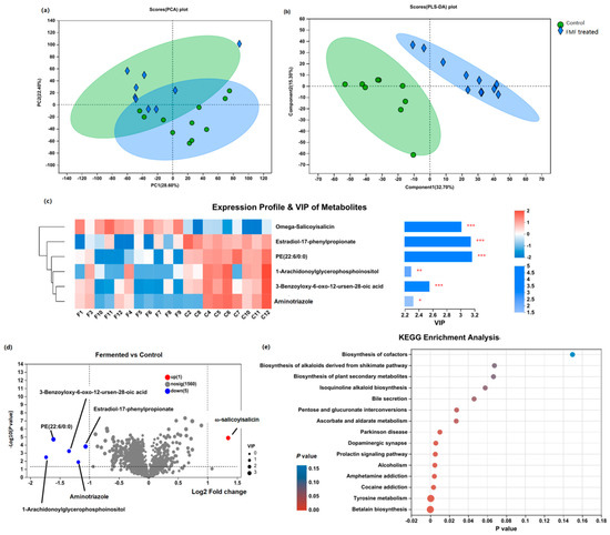 Overall, 833 annotated metabolites were identified in the ilea of the two groups, including 429 (40.62%) lipids and lipid-like molecules, 269 (25.47%) organic acids and derivatives, 114 (10.80%) organic oxygen compounds, and 103 (9.75%) organoheterocyclic compounds (Figure S2). A score plot of the PCA results showed that PC1 and PC2 explained 27.50% and 21.60% of the total variance, respectively (Figure 4a). The PLS-DA revealed that samples from the FMF group were distinguishable from those from the control group (Figure 4b). Six differential metabolites were screened via the PLS-DA (VIP > 1; p < 0.05; fold change > 2), including one upregulated metabolite (ω-salicoyisalicin) and four decreased metabolites (estradiol-17-phenylpropionate, aminotriazole, 3-benzoyloxy-6-oxo-12-ursen-28-oic acid, phosphatidyl ethanolamine (PE, 22:6/0:0), and 1-arachidonoylglycerophosphoinositol) in the FMF group (Figure 4c,d and Table S5). A KEGG analysis of the 34 differential metabolites (Table S5) screened via the PLS-DA (fold change > 1.5) showed that these altered metabolites were enriched in the betalain biosynthesis, tyrosine metabolism, cocaine addiction, and ascorbate and aldarate metabolism pathways (Figure 4e).