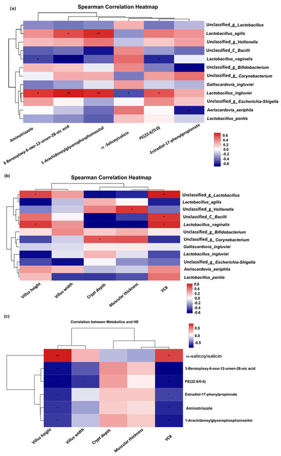 As shown in Figure 5a, the relative abundance of Lactobacillus_vaginalis_g_Bacillus demonstrated negative correlations with the contents of aminotriazole, PE (22:6/0:0) and 3-benzoyloxy-6-oxo-12-ursen-28-oic acid, while the abundance of Lactobacillus ingluviei was positively correlated. In addition, unclassified_g_Bifidobacterium and Aeriscardovia aeriphila were negatively correlated with estradiol-17-phenylpropionate, ω-Salicoyisalicin, and L. ingluviei. Furthermore, positive correlations were found between the abundance of Lactobacillus_vaginalis and villus height and VCR; positive correlations were also found between the abundances of unclassified_g_Lactobacillus and unclassified_c_Bacilli and VCR (Figure 5b). The contents of aminotriazole, PE (22:6/0:0), estradiol-17-phenylpropionate, and 1-arachidonoylglycerophosphoinositol were negatively associated with villus height and VCR, while ω-salicoyisalicin was positively correlated with villus height and VCR (Figure 5c). A negative correlation was also found between villus width and PE (22:6/0:0).