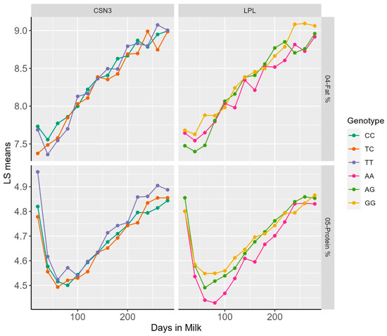 Representative examples of DIM classes and least square means for dPP and dFP for the LPL, as well as dPP and SCS for CSN3, are reported within the lactation patterns of different genotypes (Figure 1).