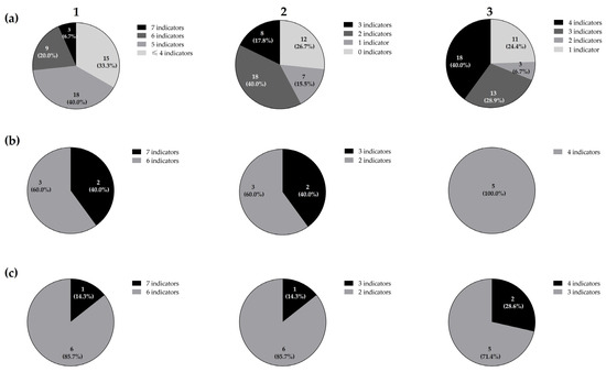 Distribution of the total 45 LAB isolates (a), five Lc. paracasei (b), and seven Lb. plantarum (c) isolates from the rearing tank of rotifers according to their direct antimicrobial activity spectrum against the 11 total (1), three Gram-positive (2), and eight Gram-negative (3) ichthyopathogens by a SOAT.