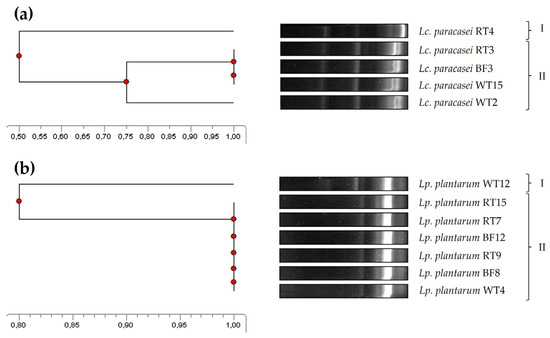 The genetic relatedness of the five Lc. paracasei and seven Lp. plantarum isolates was accomplished by ERIC-PCR, a molecular fingerprinting method widely and successfully used for bacterial typing and epidemiological studies to determine, for instance, the genetic relatedness between isolates from different origins [43,44]. In this regard, four of the Lc. paracasei were grouped into a single main cluster (similarity ≥ 75%), showing a 50% similarity to the remaining isolate (Figure 2a). As for the Lp. plantarum isolates, six of them were grouped in a main cluster (100% similarity), showing a 80% similarity to the main cluster (Figure 2b). Notably, isolates representing all the three tank origins were present in the main clusters identified for both species.